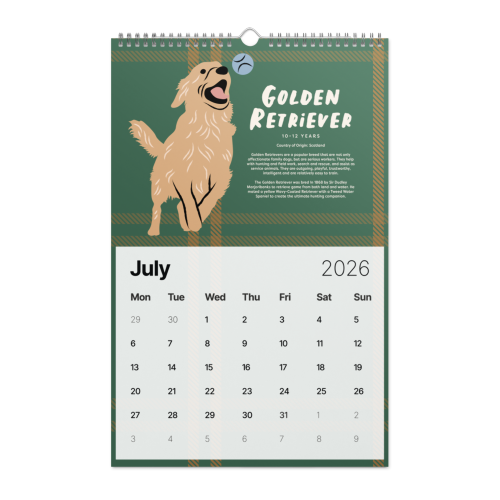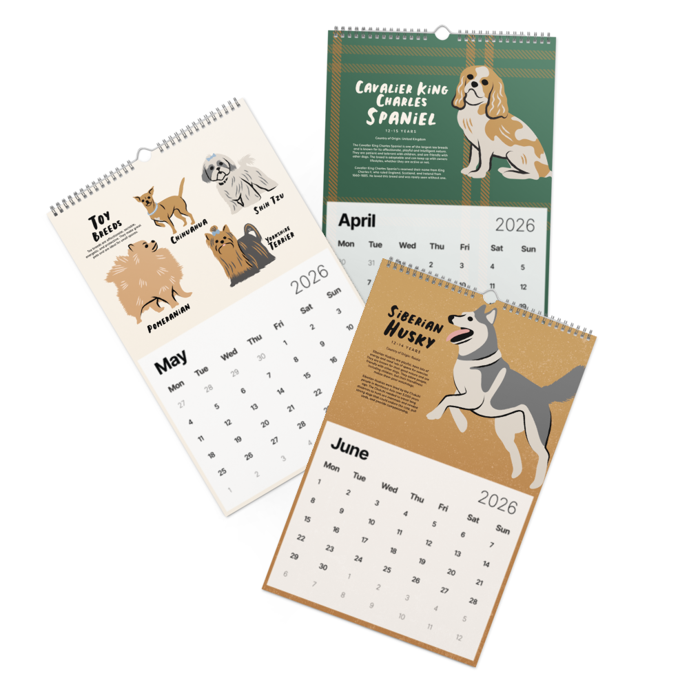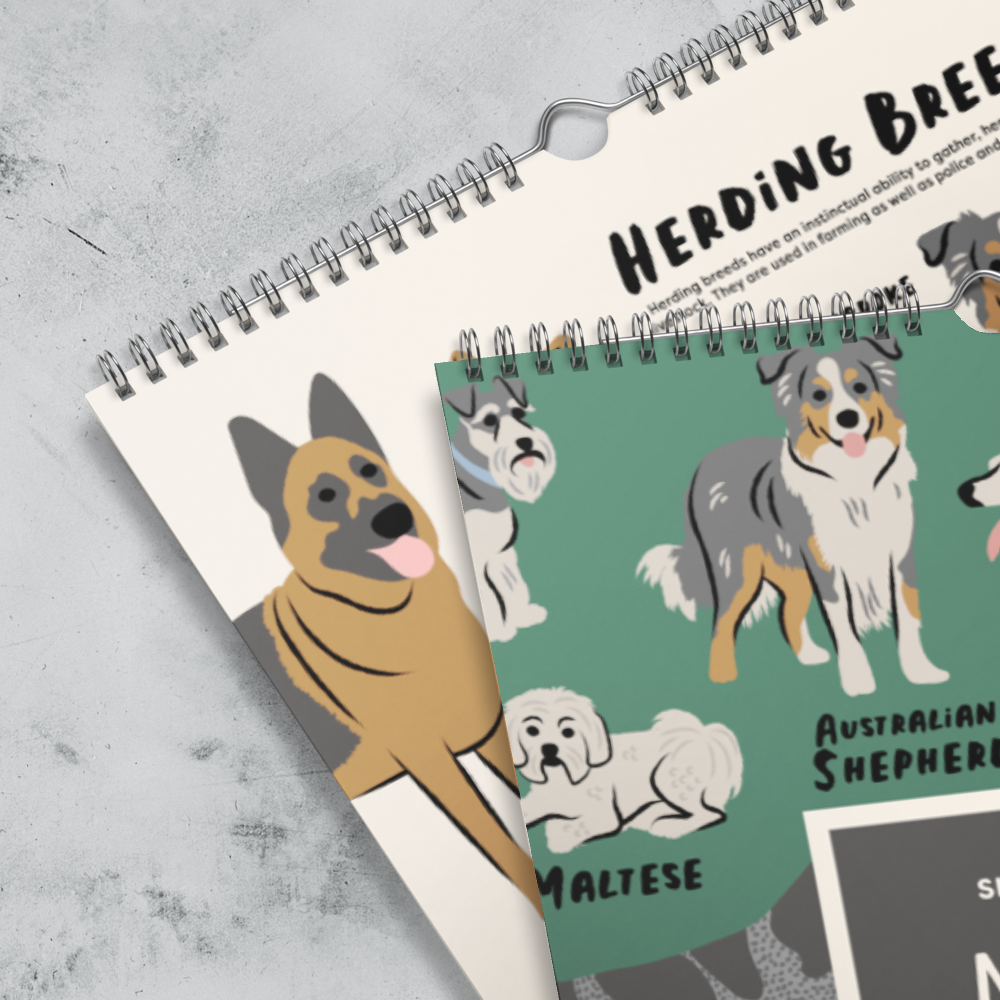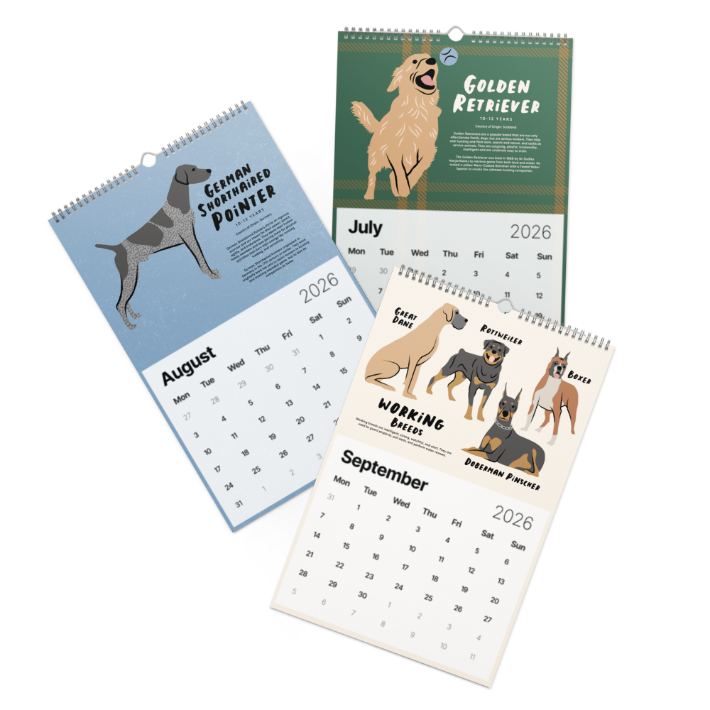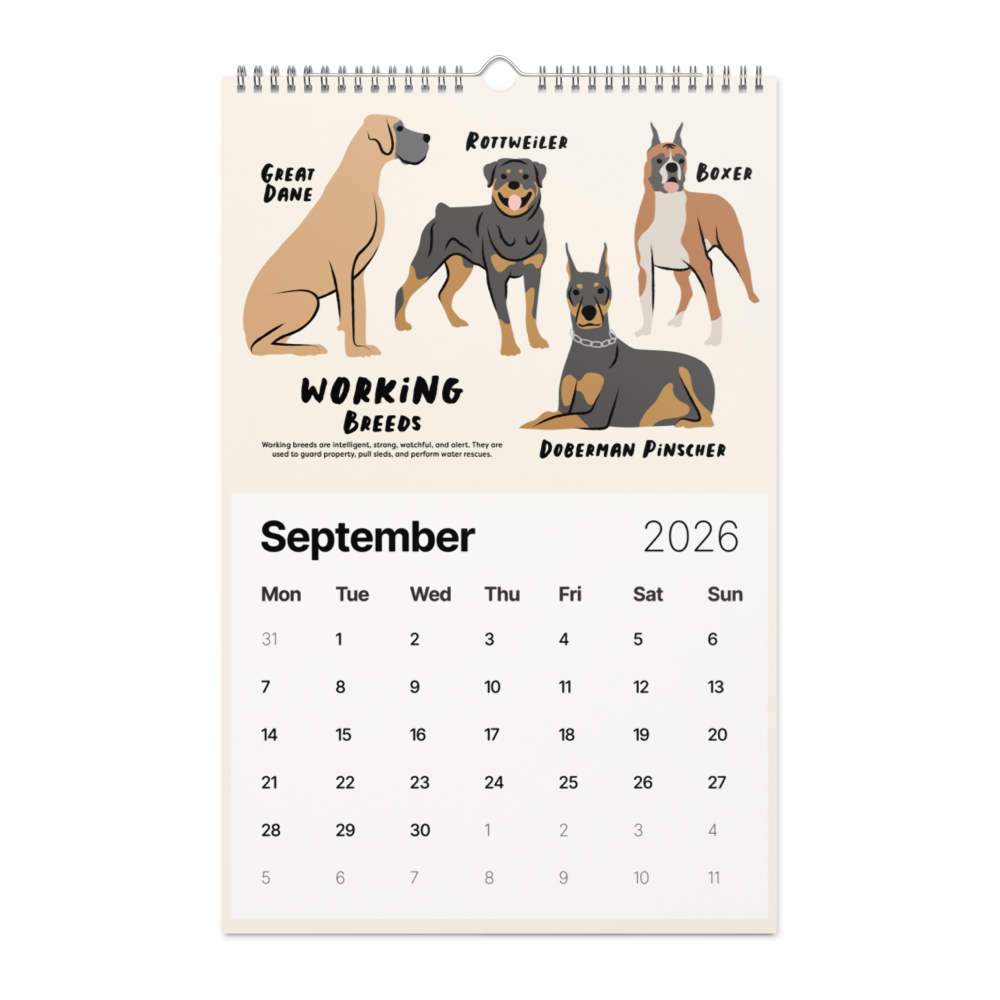 This calendar highlights 25 illustrations of popular dog breeds. Each page showcases different breeds. Some months show dogs of the same category, while others feature a single breed with background information on that dog. This calendar is sure to please any kid or dog lover.