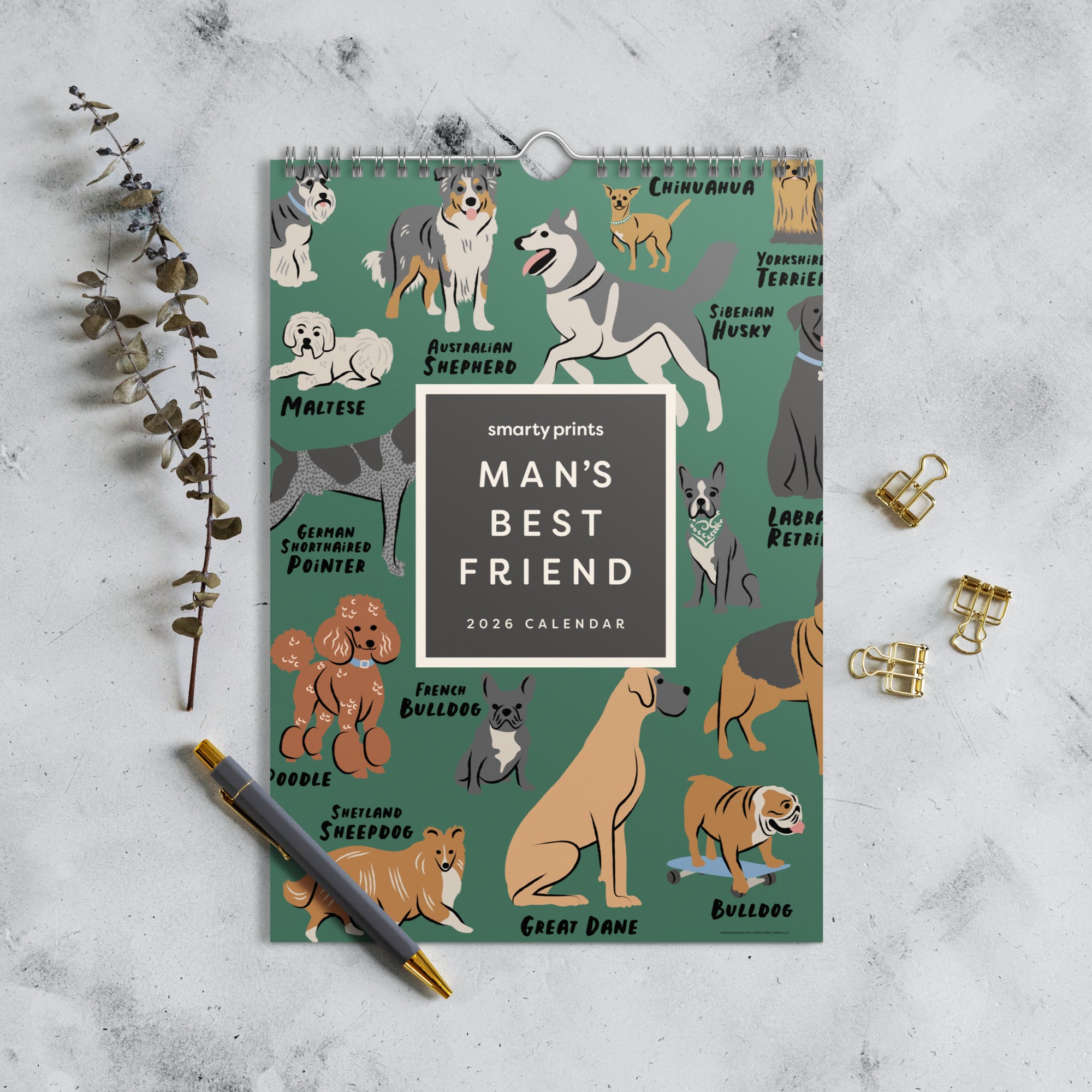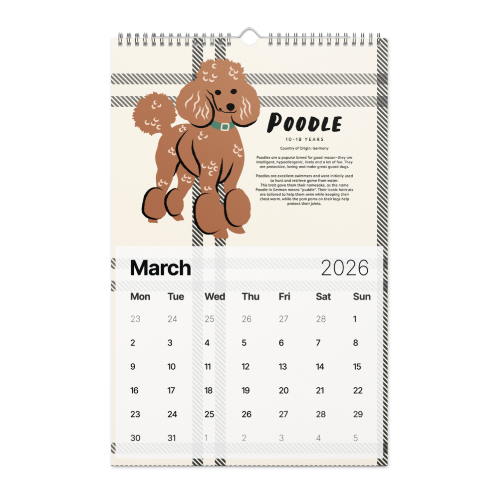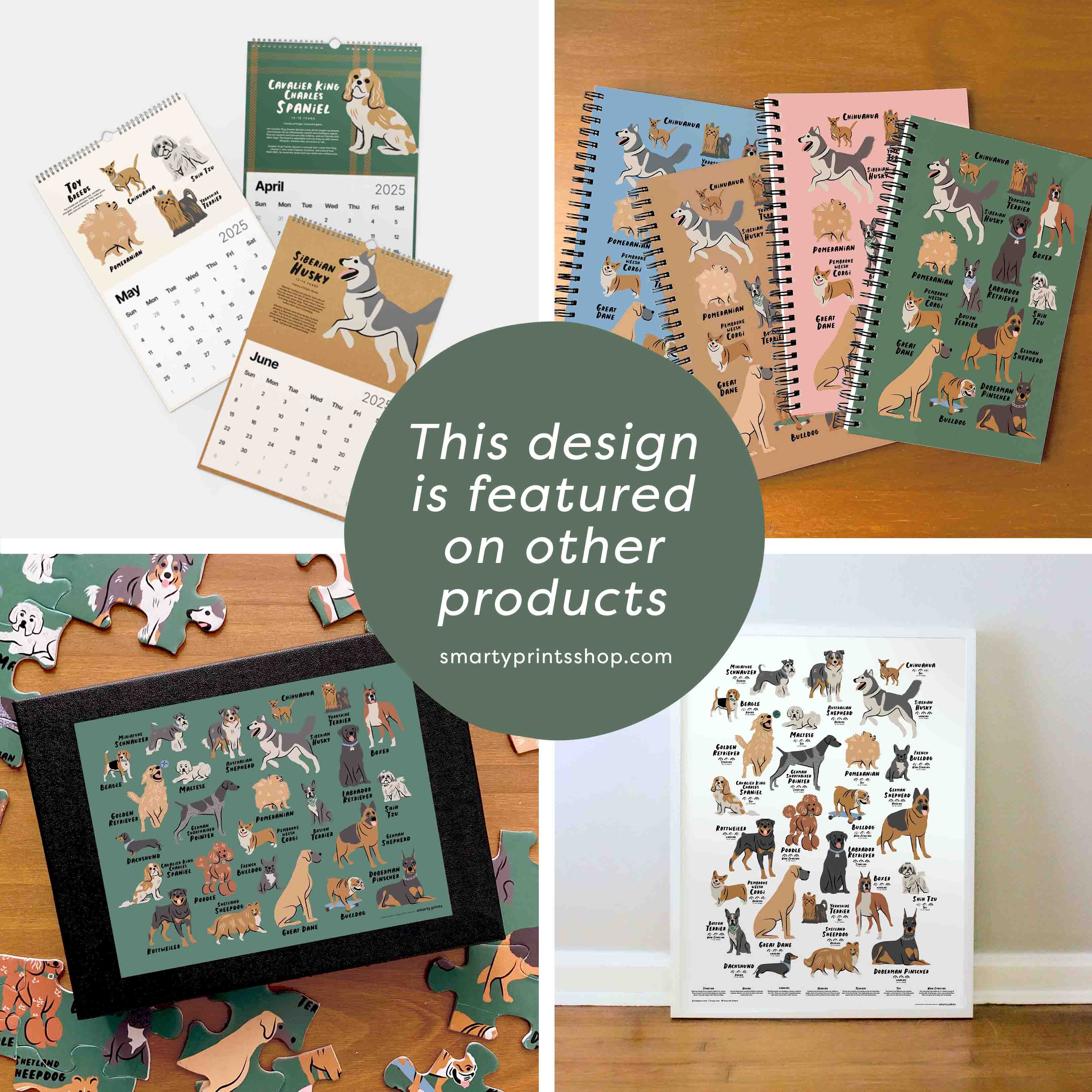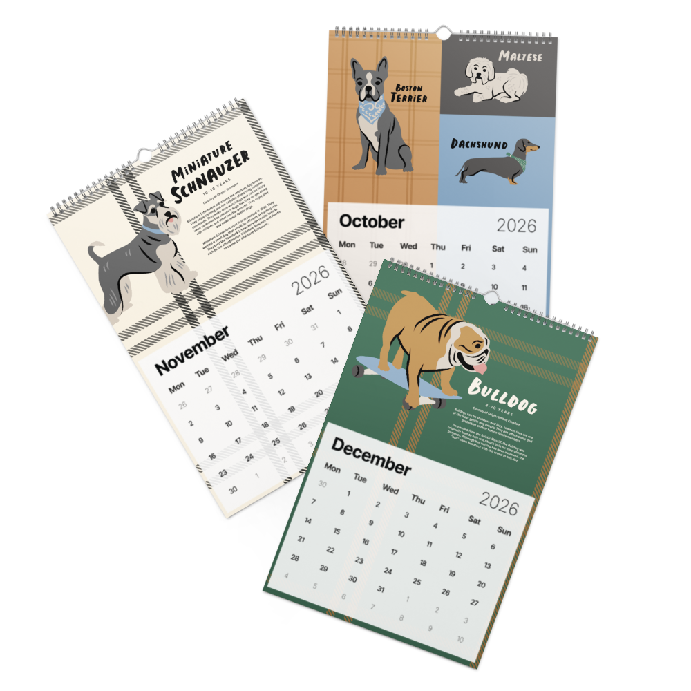 This calendar highlights 25 illustrations of popular dog breeds. Each page showcases different breeds. Some months show dogs of the same category, while others feature a single breed with background information on that dog. This calendar is sure to please any kid or dog lover.